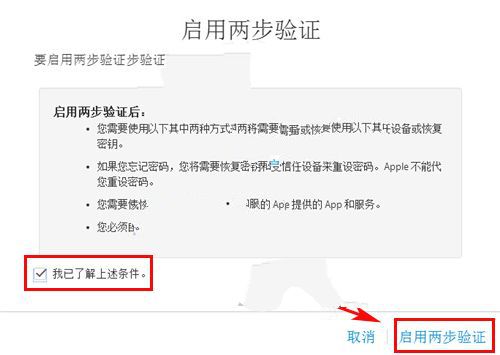 • 9)驗證后我們會收到一串【恢復(fù)密匙】,寫下來或者拍照張,(絕對絕對絕對不能弄丟該密碼匙,因為忘記密碼匙的話以后想更改密碼或者忘記密碼的話就無法再操作了,庫克也幫不了你),最后我們再仔細(xì)閱讀完相關(guān)注意事項后打上【√】,點擊【啟用兩步驗證】就可以了。(如下圖)