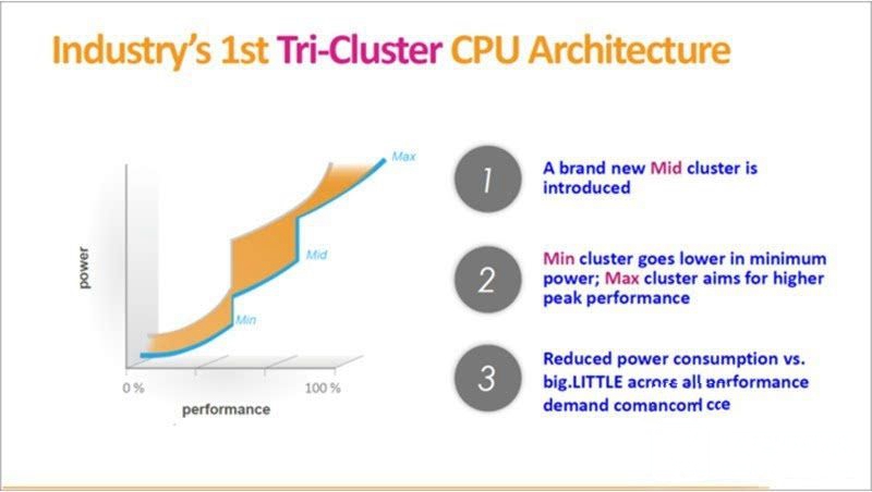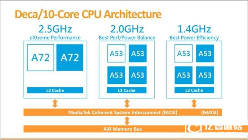 從制程工藝來看,Helio X20 采用的20nm HKMG技術并不能和已經漸成主流的16nm FinFET技術工藝相比,但其采用的Tri-Cluster處理器架構帶來大量優勢。Tri-Cluster架構主要分為三個部分,第一個部分由兩顆ARM Cortex-A72所組成的單架構(以2.3GHz工作頻率運作,提供極致性能),第二、第三個部分分別含四顆ARM Cortex-A53的架構(其中一個架構負責中等負載任務,以2.0GHz頻率運作;另一個則負責執行輕度負載任務,以1.4GHz頻率運作),可以良好解決移動設備面對各種高度、中度以及輕度負載工作項目時的性能功耗平衡。