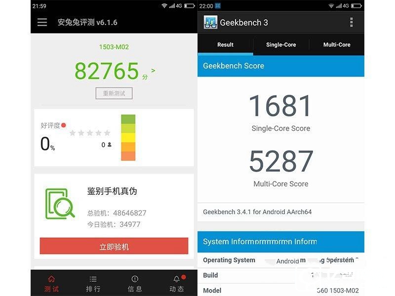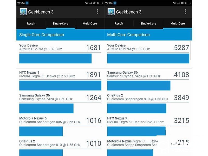 從安兔兔跑分來看,82765基本符合預期,Helio X20配合4GB內存已經超越了上代頂級安卓旗艦。Geekbench3跑分結果也極為類似,單雙核跑分均大幅領先三星Galaxy S6,應該可以稱得上性能強悍。