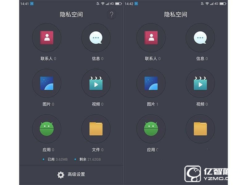其次是隱私空間,用戶可以把私密的信息保存到該空間中然后設置加密方式:指紋、數字和圖案。這個隱私保護空間異常強大,和市面上常見的文件加密大大不同。
