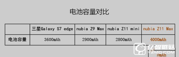 就硬件方面來說,nubia Z11 Max配備了一塊4000mAh大容量高密度電池(注:不可拆卸)。相比前作nubia Z9 Max,以及nubia Z11 mini都存在明顯優(yōu)勢。這無疑是眾多努比亞粉絲所期待的。事實(shí)上,相比大屏手機(jī)三星Galaxy S7 edge,nubia Z11 Max的電池配置同樣具備優(yōu)勢,如下圖所示。由此可見,努比亞滿滿的誠意。