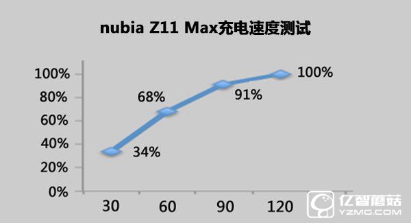 當(dāng)然,低耗電量僅是一個方面,4000mAh大電池多久能夠完全充滿也是我們關(guān)注的點(diǎn)。事實(shí)上,nubia Z11 Max支持nubia快充3.0技術(shù)。經(jīng)過測試,電量完全耗盡后,通過原裝充電器充電10分鐘,電量增至11%;充電30分鐘,電量增至34%;充電60分鐘,電量則增至68%;兩小時左右,則完全充滿。需要