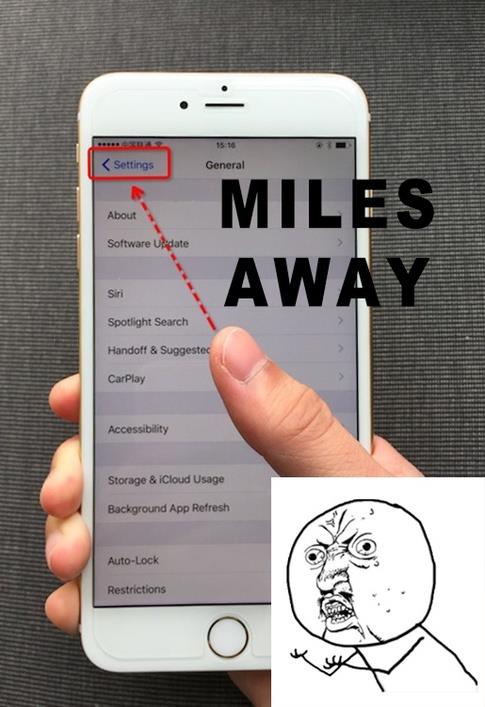 正如剛才所說,iPhone是否易用,永遠(yuǎn)最多人吐槽的是“返回”按鈕(下圖):這個(gè)按鈕位于畫面的左上角,正好是我們拇指最難觸碰到的位置。