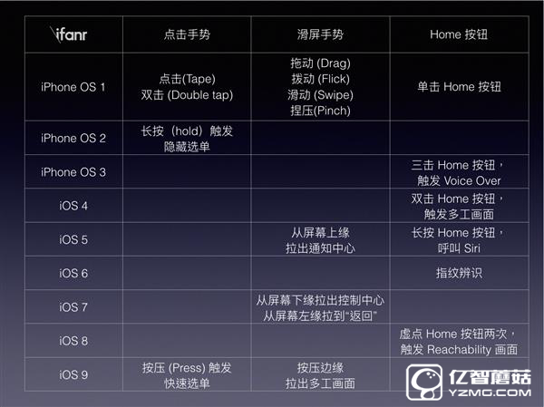 下圖是歷年iOS所新增的全新的觸控交互方式(不包括iPad的新手勢(shì)),我們可以看到iPhone的觸控交互手段的變化:
