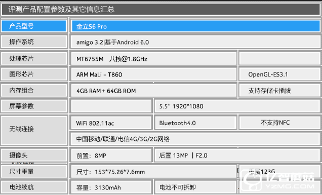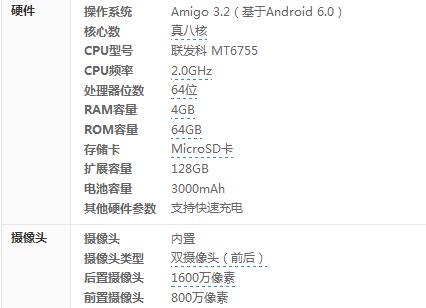 金立S6 Pro的基本參數(shù):其擁有一塊5.5英寸1920*1080分辨率屏幕,內(nèi)置聯(lián)發(fā)科MT6755M八核處理器,最高主頻1.8GHz,配備4GB RAM+64GB ROM。拍照方面是前置800萬像素+后置1300萬像素的組合,預裝基于Android 6.0系統(tǒng)的amigo 3.2,電池容量3130毫安時。