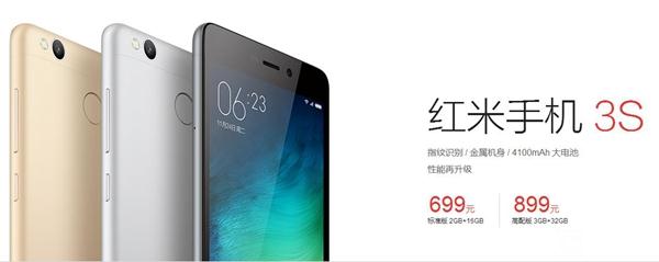 紅米3S依然分為標準和高配兩個版本,其中標準版(2GB內(nèi)存+16GB存儲)售699元,高配版(3GB內(nèi)存+32GB存儲)售899元。