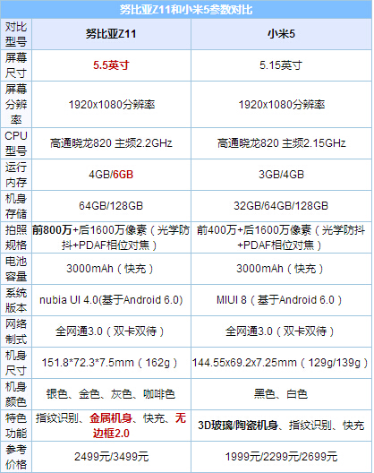 由于努比亞Z11擁有兩個版本,小米5擁有三個版本,為了公平對比,這兩款機型分別對比的版本是nubia Z11標準版和小米5尊享版,售價差距為2000元。