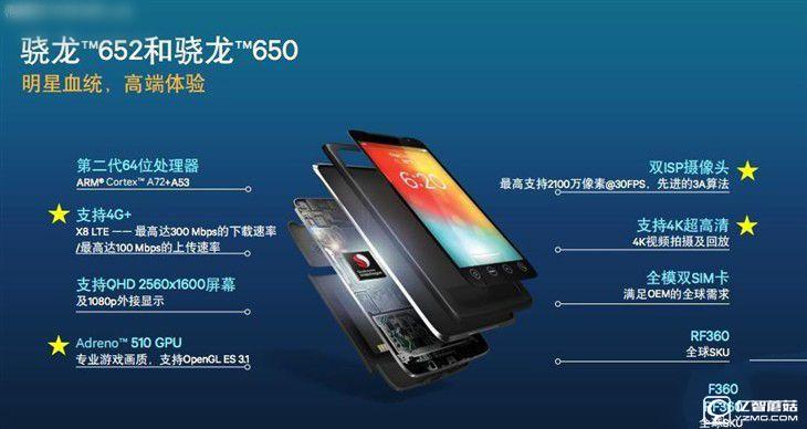高通驍龍652/650處理器采用28nm更先進的低功耗工藝制程,由ARM Cortex A72+A53兩部分架構組成。兩個型號的區別在于驍龍652是8核(4個A72+4個A53),驍龍650為6核(2個A72+4個A53)。Cortex A72性能強悍,是Cortex-A57的升級版,而A57是驍龍810/808的核心,而經過大量的真機體驗和測試,高通驍龍652/650在性能上十分接近高通驍龍820了。