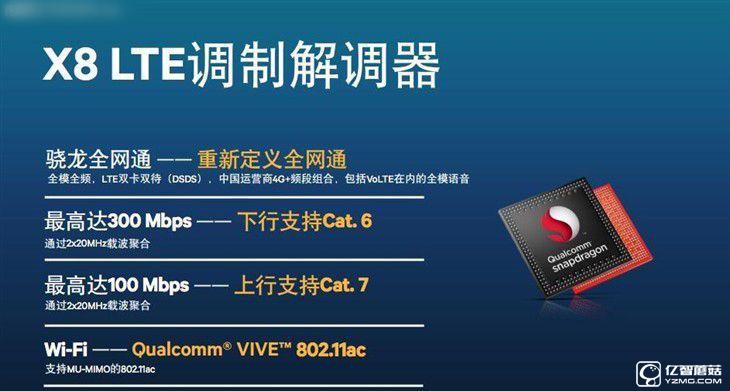 除了新架構核心、GPU和改進的工藝以外,高通驍龍652/650處理器還集成了X8 LTE調制解調器,兼容包括4G+在內的的所有網絡,獲得最高300Mbps的下載速度以及100Mbps的上傳速度,可實現LTE雙卡雙待、全頻全模和VoLTE,同時,將WiFi連接技術也升級到了最新的MU-MIMO的802.11ac標準。