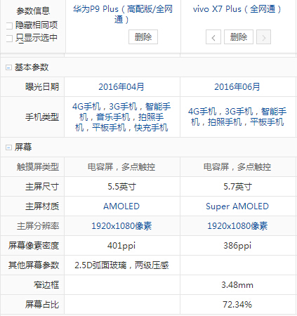 vivo x7 Plus和華為 P9 Plus配置參數詳細對比: