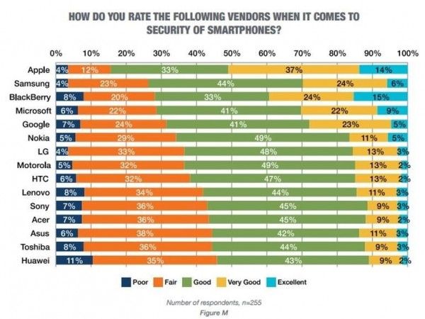 從排名來(lái)看,手機(jī)安全性排名前十五的手機(jī)品牌分別是(按前后順序):蘋(píng)果、三星、黑莓、微軟、谷歌、諾基亞、LG、摩托羅拉、htc、聯(lián)想、索尼、宏?、華碩、東芝和華為。