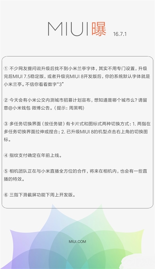 此外,MIUI三指下滑截屏功能下周上開發(fā)版。