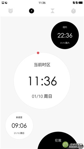 第一代氫OS中,圓形的時(shí)間設(shè)計(jì)就被用戶追捧,大小不同黑白區(qū)分的圓展現(xiàn)出各個(gè)時(shí)區(qū)的時(shí)間,能夠讓用戶一眼分辨,卻又不會(huì)單調(diào)。