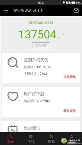 ▲用安兔兔跑分軟件測試,一加手機3的分數為137504分。