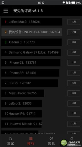 其實我們從它搭載的硬件配置中就能看出,一加手機3絕對是目前安卓手機中最頂級的配置了,所以跑分也只是個從側面證明的數據。在目前排行榜中排名第二,與第一名相差500分左右,而且跑分每次都會有誤差。從配置和售價方面來看,它絕對算的上是“旗艦機殺手”了。