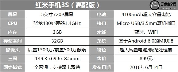 紅米手機(jī)3S采用手感適中的5英寸屏幕,搭載高通驍龍430八核處理器,內(nèi)置3GB+32GB的內(nèi)存組合,擁有4100mAh的大容量電池,前置500萬(wàn)像素?cái)z像頭,后置1300萬(wàn)像素?cái)z像頭,并且支持指紋識(shí)別功能。