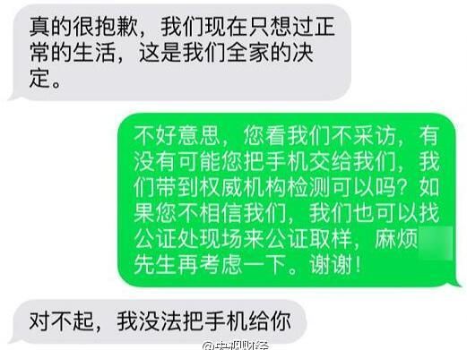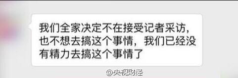用戶(微信內容):我跟你說一下,剛剛我們全家的決定是不再接受采訪,隨便哪個媒體都不接受,不好意思,麻煩你通知你的同事,我們只想過正常生活。