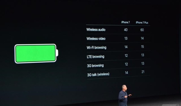 蘋果官方給出的數(shù)據(jù)顯示,iPhone 7電池使用時間比iPhone 6S最長增加2小時,iPhone 7 Plus電池使用時間比iPhone 6S Plus最長增加1小時。