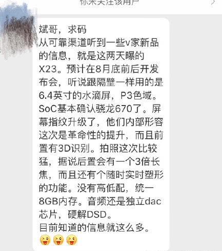 其他配置方面,vivo X23會搭載驍龍670處理器、屏幕指紋,據悉屏幕指紋會有較大升級,或許APEX的半屏指紋。另外,vivo X23或將采用可捕捉3D深度的TOF后置相機、并支持3X光學變焦,拍照能力無疑會進一步提升。