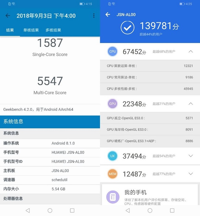 在GeekBench中,榮耀8X的得分為單核1587、多核5547。在安兔兔中,它的跑分逼近14萬分。從跑分來看,麒麟710的性能符合一款中端處理器的表現,和高通陣營的驍龍660比較接近。