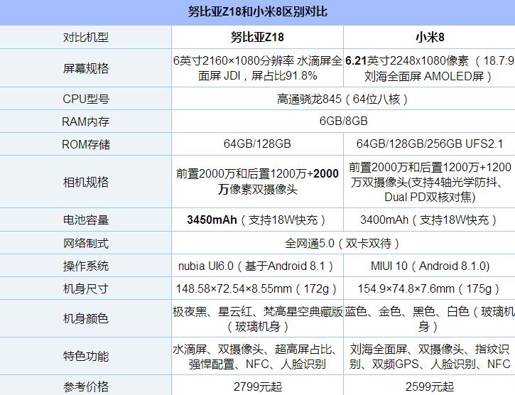 既然是全方位對比,那自然繞不開參數部分了,以下是努比亞Z18和小米8配置、價格對比,如下表格所示。