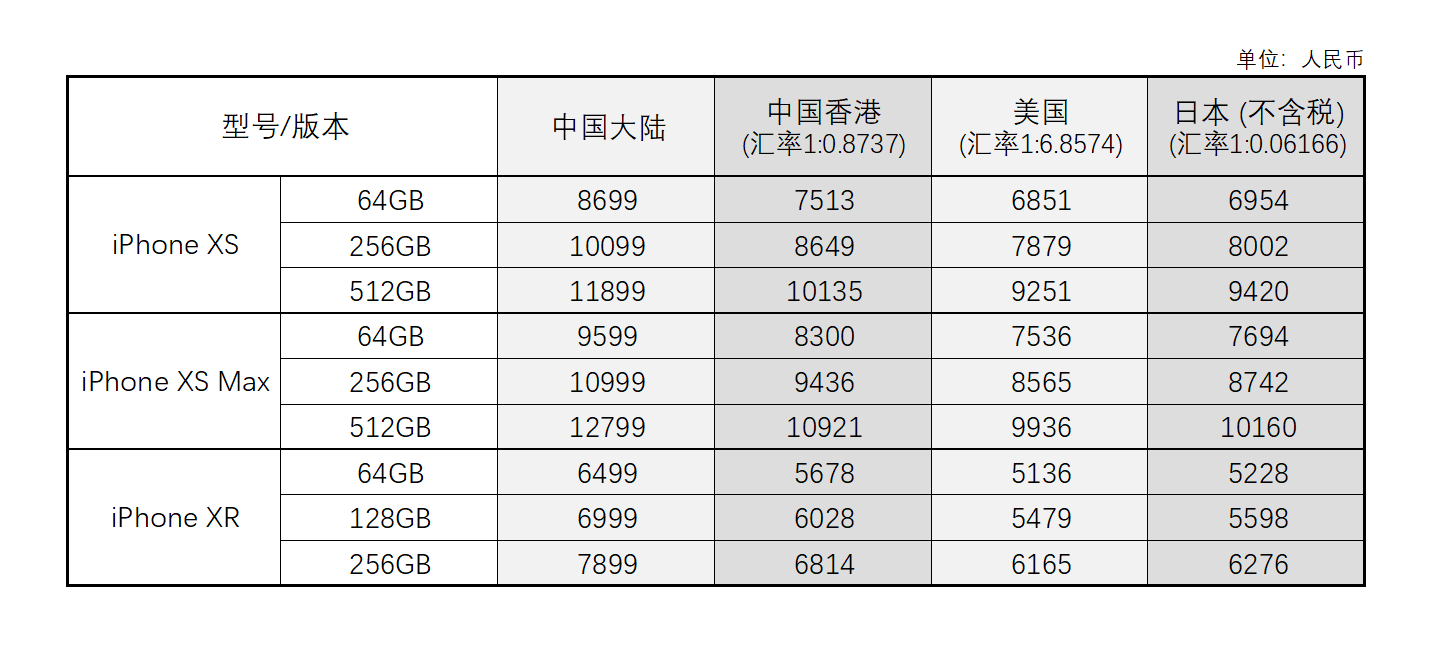 iPhone XS/XS Max和iPhone XR四大國家地區售價對比:中國大陸最貴