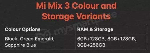 根據(jù)國外網(wǎng)站Mysmartprice獨家披露的消息稱,小米MIX3此次將會帶來6+128GB/8+128GB和8+256GB等三種存儲組合選擇,與此前的傳聞比較吻合,而配色方面則會有黑色,寶石藍(lán)以及在小米MIX2s出現(xiàn)過的翡翠綠等。