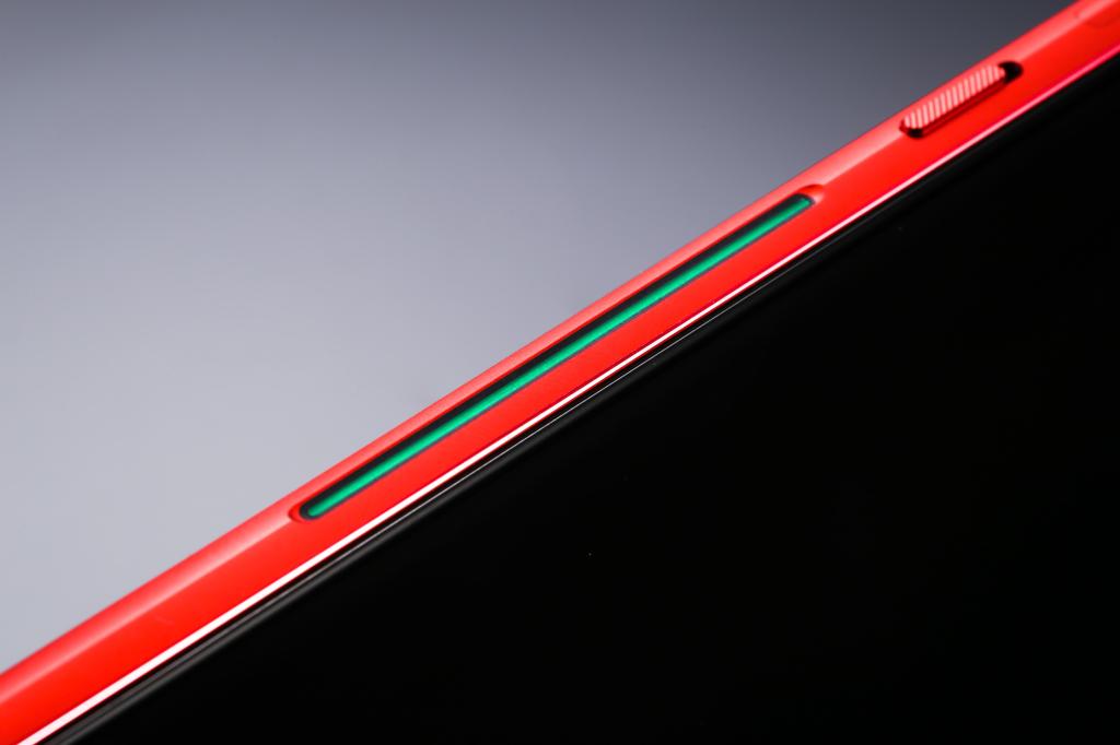 區別于第一代黑鯊游戲手機的黑、灰冷色系風格和浴天藍版本,黑鯊Helo首次引入大紅配色,滿滿的科技時尚感撲面而來。雖說延續了此前的跑車造型設計,但機身背面的一整塊3D玻璃光暈背板,對視覺、觸覺的提升非常明顯。再搭配凝光棱、鰭形鯊魚紋等細節設計,整機的質感不遜色于市場上任何一款旗艦。