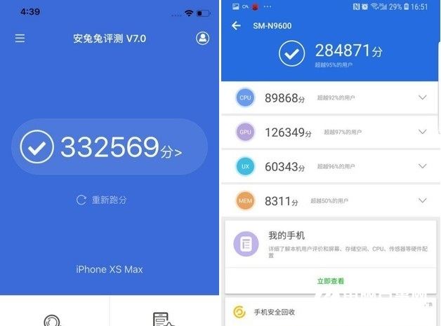 iPhone XS和三星Note9安兔兔跑分對比