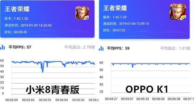 從目前主流的快否軟件中實時監控兩款手機運行《王者榮耀》的游戲幀率就會發現,OPPO K1的平均幀率為59fps,游戲穩定性也要稍微高于小米8青春版,波動的幅度非常小,幾乎都處于一條直線上。小米8青春版的表現整體也不錯,但在穩定性上還有很大的提升空間。