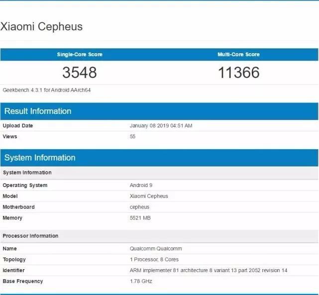 此前GeekBench跑分網站上出現了一款代號為“Cepheus”的小米新機,該機可能是即將發布的小米9,它搭載的是高通驍龍855移動平臺。高通早前就稱2019年共有30部手機將搭載高通驍龍855處理器,自然小米9自然也包括其中。