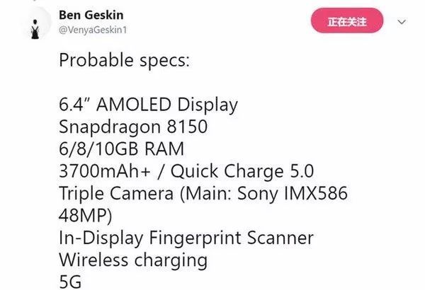 著名爆料人Ben Geskin爆料,小米9將搭載QC 5.0快充,內置3700mAh容量電池,提供6/8/10GB運行內存,擁有5G版本。