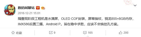 國內爆料者@數碼閑聊站 補充了部分小米9的信息,他表示小米9將會采用水滴屏設計而非“挖孔屏”,但正因為如此小米9才得以加入屏幕指紋功能。