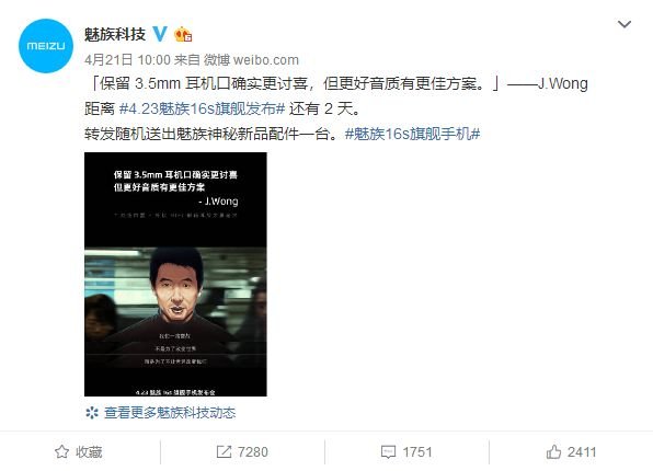 經(jīng)過了漫長的等待,苦心期盼的魅友們上周終于等來了官方發(fā)來的好消息。據(jù)魅族科技官方表示,魅族新旗艦16s將會(huì)在4月23日(今天)在珠海發(fā)布。現(xiàn)在魅族官方又放出了最新預(yù)熱消息:該機(jī)的的3.5mm耳機(jī)孔已確認(rèn)要取消了。