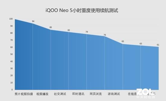 經過5小時的重度使用續航測試后,電量還剩余61%,即使是手機重度使用用戶,iQOO Neo也能滿足一天的使用需求。不僅是超大電池,iQOO Neo還配有AI智能省電優化技術,針對不同的使用場景,可以匹配更加智能的電源管理方案,讓大電池續航更加持久。