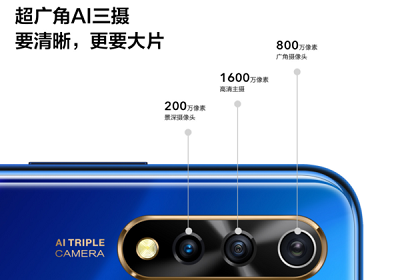 在相機方面,vivo Y7s后置AI三攝,分別為擁有1600萬像素的高清主攝像頭、擁有800萬像素的廣角攝像頭以及擁有200像素的景深攝像頭。其中主攝1600萬像素攝像頭采用索尼CMOS——IMX499。vivo Y7s同樣支持超級逆光拍照,動態范圍高達12.3EV。