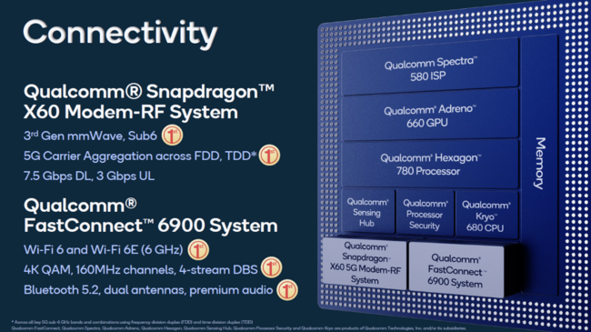 驍龍888是全球最先進的5G移動平臺,集成的高通第三代5G調制解調器及射頻系統——驍龍X60,支持全球毫米波和Sub-6GHz全部主要頻段、TDD和FDD 5G載波聚合、獨立(SA)和非獨立(NSA)組網模式,是真正面向全球的5G解決方案。