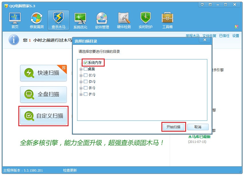 您可以通過自定義掃描設定需要掃描的位置,只需要在彈出的掃描位置選項框中勾選需要掃描的位置,再點擊“開始掃描”,QQ電腦管家就會按您的設置開始進行掃描。