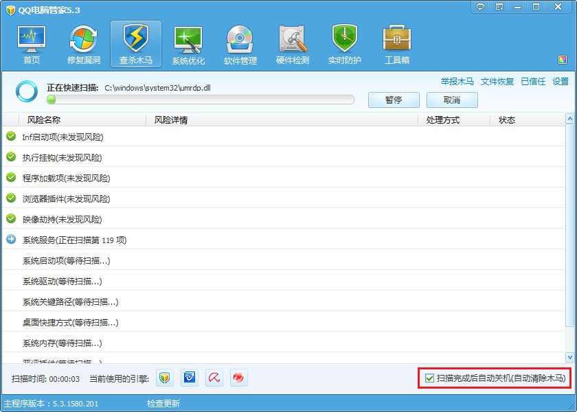 答:當您使用木馬查殺的“全盤掃描”或“自定義掃描”時,會在掃描界面的左下角出現“掃描完成后自動關機”的選項,您只要勾選了該選項,QQ電腦管家就會在木馬掃描完成后,自動清除發現的風險,并且自動關機。