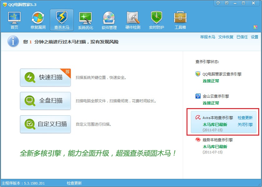 答:QQ電腦管家從4.5版本開始,引進國際領先的本地查殺引擎,大大提高木馬查殺能力。您在安裝完QQ電腦管家后,即默認開啟了雙引擎模式,同時病毒庫的也將自動升級,讓您輕輕松松就能體驗強大的木馬雙引擎查殺能力。