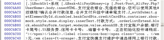 在進行完以上的準備活動后,此木馬就開始監控用戶的所瀏覽的網址,區別于以往的代碼注入,或者劫持API之類的手法,此類木馬使用了一種更為簡便而且行之有效的方法:定時器。而這種手段可能被某些主動防御所忽略。此類木馬一般設置了三個或以上的定時器。觸發的時間間隔是200毫秒。這個時間間隔足以監控到用戶對網站的操作。其中一個定時器,會通過GetCursorPos獲得當前鼠標的位置,進而獲得當前窗口的句柄。然后通過向Webbrowser控件(窗口類名是"Internet Explorer_Server")發一個WM_HTML_GETOBJECT的消息獲得IHTMLDocument對象。獲得此對象后,木馬作者就可以對該頁面進行任何操作:解析該頁面元素,竊取自己感興趣的任何內容,篡改支付信息等等,以下是在病毒中截取到的一個字符串的片段: