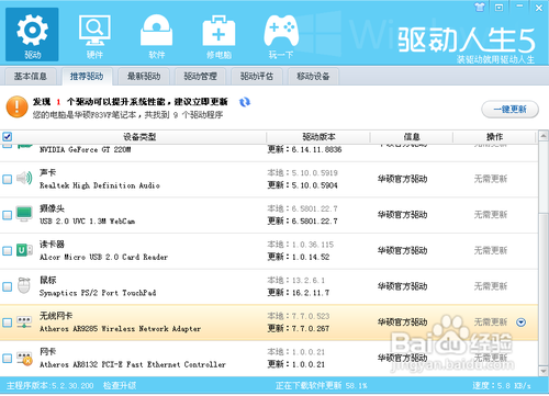 也可以把網卡卸載安裝一遍,當然也可以用驅動精靈把網卡的驅動更換一下,當然后者比較安全所以建議更新網卡驅動: