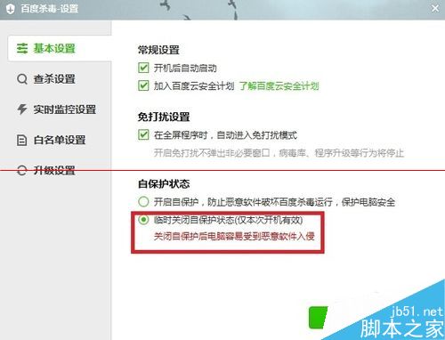 1、打開百度殺毒-設置-基本設置-自保護狀態(tài)-臨時關閉自保護狀態(tài)(僅本次開機有效)-確定。不用管百度殺毒關于關閉自保護后電腦容易受到惡意軟件入侵的提示。