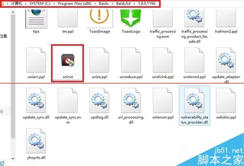 2、進入百度殺毒安裝路徑:C:Program Files (x86)BaiduBaiduSd1.8.0.1196,默認安裝路徑在C盤系統(tǒng)盤,1.8.0.1196是版本號,不同人的版本號可能不同,不會影響,找到文件夾下的uninst卸載程序-雙擊。