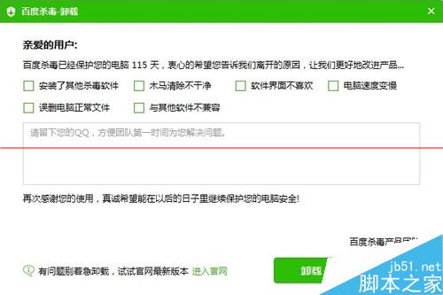 3、選擇卸載百度殺毒的理由,木馬清除不干凈等理由建議都選一下,讓百度殺毒改進其殺毒軟件的性能-卸載。