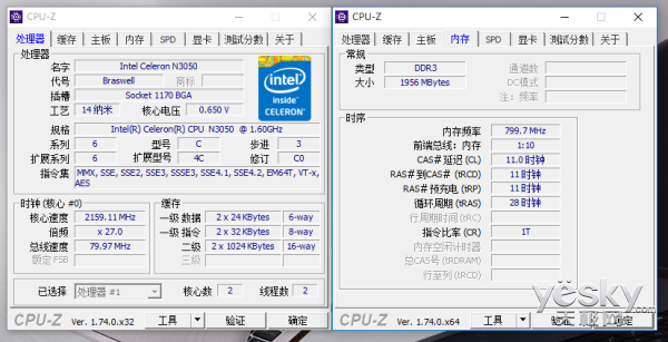 從CPU-Z中可以看出華碩TP200S采用的Intel Celeron N3050處理器,這款處理器并不是十分強大,但對于平時使用還是能夠勝任的。內存方面,從容量上看是2GB的配置,對于現在的筆記本來講,這要的容量略小,不還用戶如果有需求可以自己增加,以保證性能更加強大。