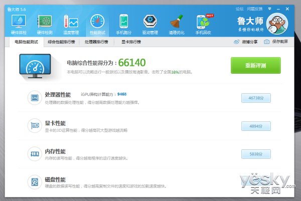 在魯大師的測試中,這臺電腦的綜合成績為66140分,從得分上看來,這臺筆記本主要的特點還是便攜方便,簡單的出差辦公最為合適。