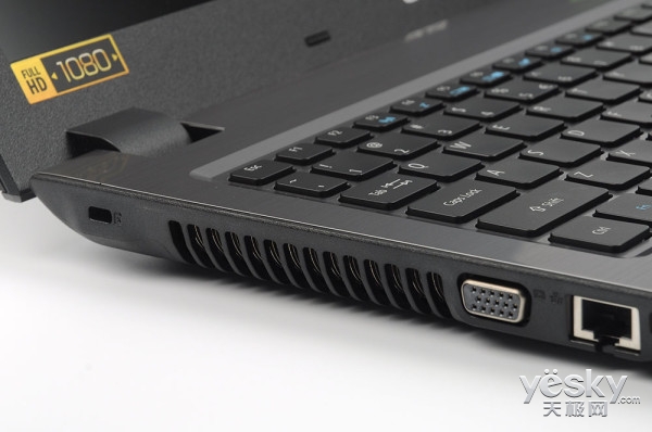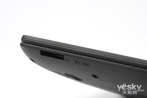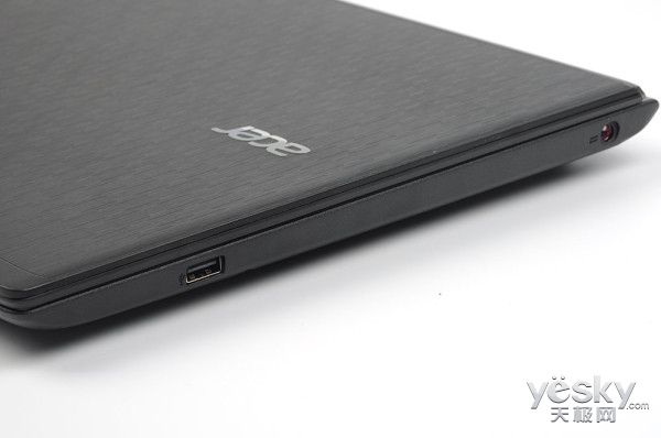 另一側為USB2.0接口,從方向上是為接入鼠標準備,電源適配器接口也在右側,為機內的6芯鋰電池充電。整個接口布局上較為中規中矩,符合Acer一貫的大氣、人性化設計思路。