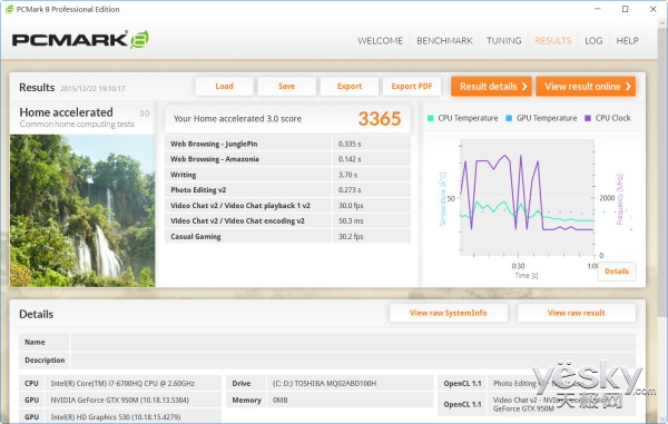 隨后我們對這臺Acer V5-591G進行PCMARK8測試,其搭載了英特爾第六代酷睿i7-6700HQ處理器、GTX 950M獨立顯卡、海力士DDR4-2133 8GB內存以及東芝8GB閃存+1TB機械硬盤。