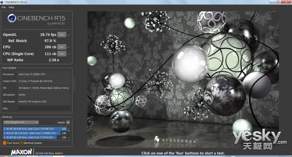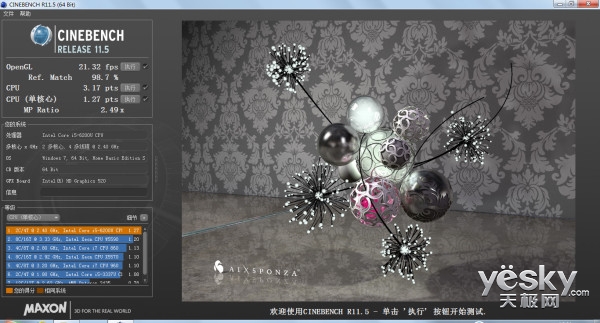 CINEBENCH R11.5支持Windows XP和Vista的X86/X64系統,以及PowerPC和Intel架構Mac平臺,最高支持16個處理器核心!CineBench使用針對電影電視行業開發的Cinema 4D特效軟件引擎,可以測試CPU和顯卡的性能。Maxon公司表示,相對于之前的9.x版,R11.5版更能榨干系統的最后一點潛能,準確體現系統性能指標。測試包括兩項,分別針對處理器和顯卡的性能指標。第一項測試純粹使用CPU渲染一張高精度的3D場景畫面,在單處理器單線程下只運行一次,如果系統有多個處理器核心或支持多線程,則第一次只使用一個線程,第二次運行使用全部處理器核心和線程。第二項測試則針對顯卡的OpenGL性能。
